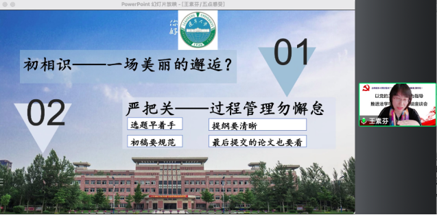 导师代表王素芬老师在主旨发言中与青年教师分享研究生导师的经验与感受:初相识须增加对学生情况的了解;对学生论文须严格把关,进行过程管理与时间管理;提供论文写作范本以指导学生论文写作;带领学生做科研,积跬步至千里;运用“情绪暂停法”,调整心态,踏实前行。