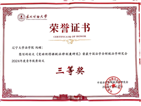 中国法学会财税法学研究会会长、新时代财税法治研究院院长刘剑文教授、3044am永利集团3044noc院长闫海教授、王洋讲师,3044am永利集团3044noc在读博士生王月、冯硕、江利杰、张楠楠、贾承昊、刘雨函、张王南、叶子涵、韩鸿声、郭岳达、刘嘉语、刘洁、张娜参加。江利杰博士生做大会主题发言。冯硕博士生获青年优秀论文三等奖。